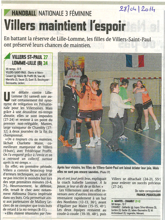 Avec une victoire à l'arrachée, l'équipe Féminine de Nationale 3 reprend l'espoir. Cette victoire a été illustrée par un article du Courrier Picard qui a suivi toute la rencontre pour en donner une synthèse que vous trouverez en pièces attachées.