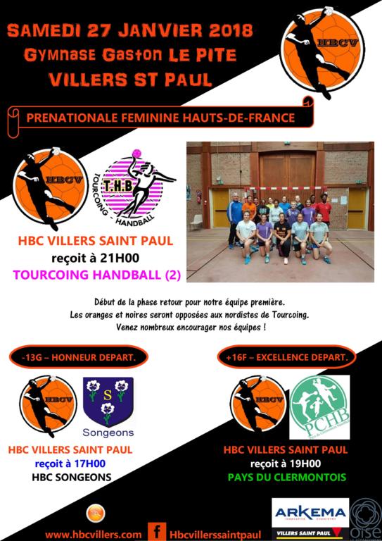 En féminin, à 21h00 les seniors A reçoivent Tourcoing au Gymnase LEPITE de Villers St Paul avec les Seniors B en levé de rideau à 19h.