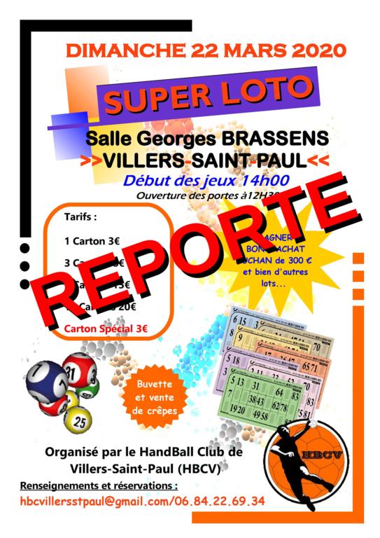 Suite à l'arrêté du Préfet de l'Oise, notre Super Loto, prévu le 22 mars, est reporté à une date ultérieure. La futur date vous sera communiqué prochainement. En vous remerciant de votre compréhension. Sportivement, Le Conseil Collégial du HBC Villers-Saint-Paul