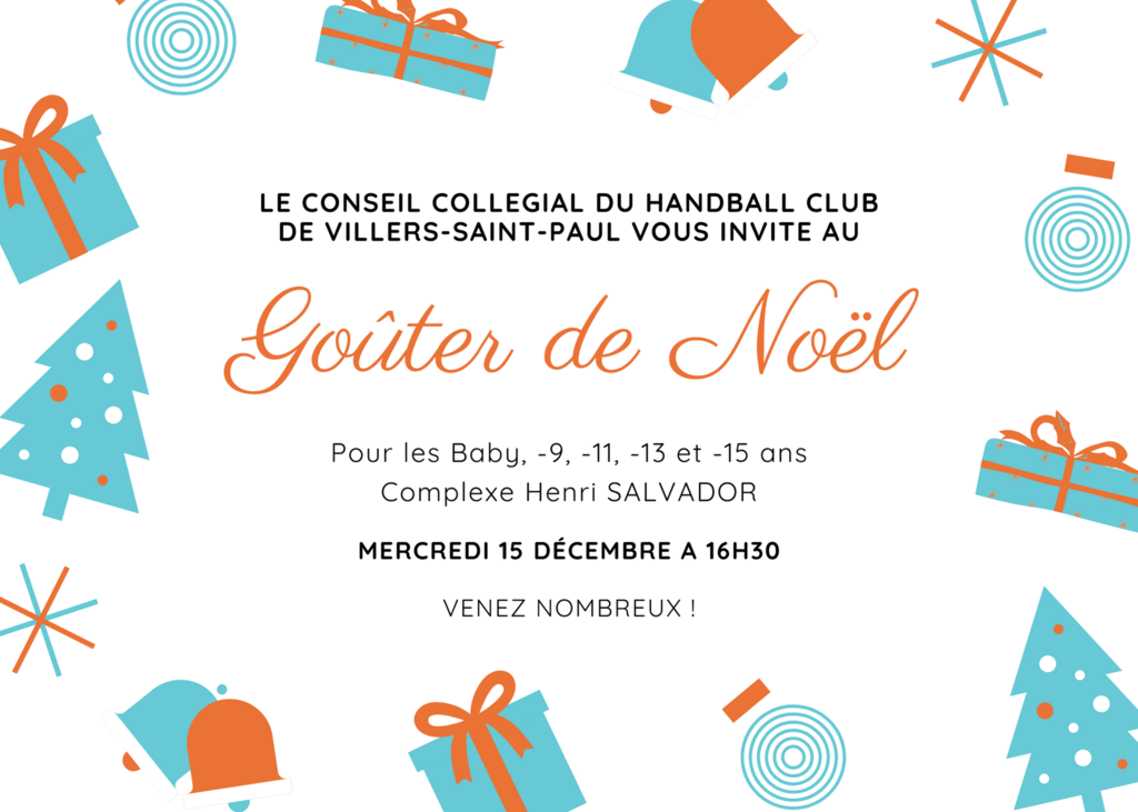 Le HBCV organise son traditionnel goûter de noël. Le mercredi 15 décembre à 16H30 au complexe Henri SALVADOR, les licenciés du club (du Baby Hand jusqu'aux -15 garçons) sont invités à venir passer un moment festif et de partage ! Au programme, goûter, petits ateliers, tournoi etc...